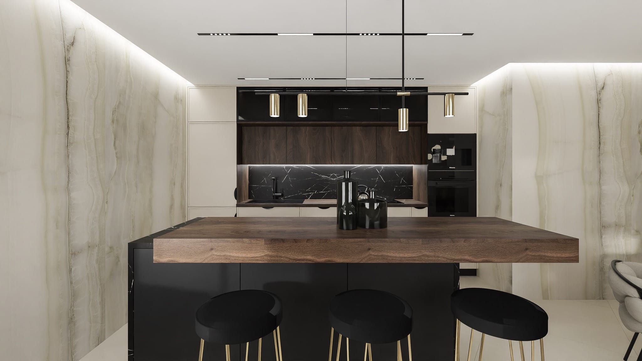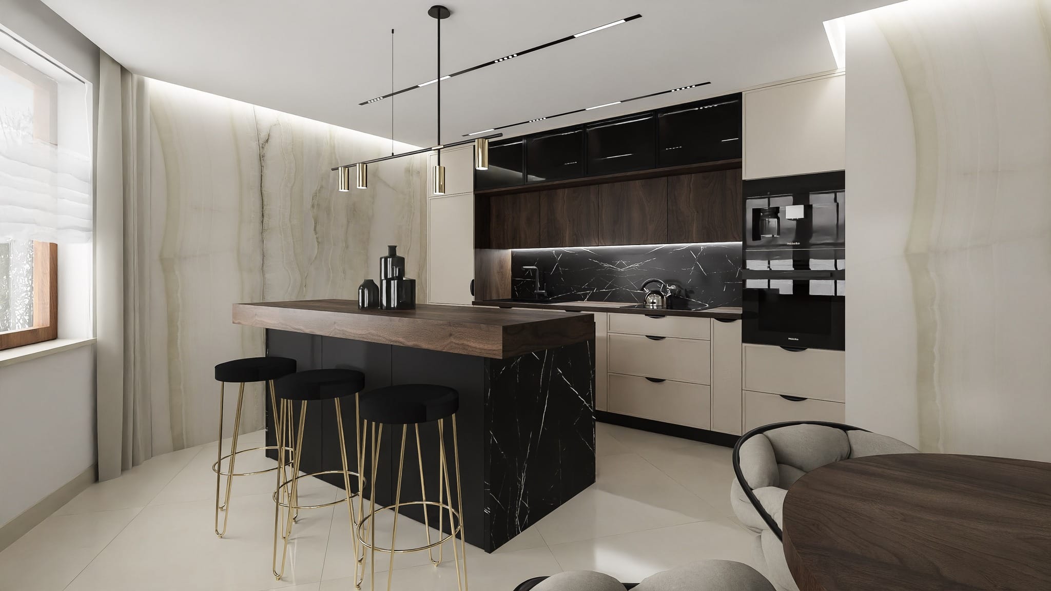 W czarnej kuchni dodatki mogą być kluczowym elementem, który nadaje pomieszczeniu charakteru i równowagi. Dodaj akcenty w postaci jasnych kolorów, takich jak: czerwień, żółć, zieleń lub niebieski, w postaci serwetek, wazonów, ozdobnych talerzy, dekoracyjnych filiżanek. Pamiętaj, że złoto, srebro, miedź i mosiądz doskonale komponują się z czernią. Dodaj metaliczne elementy, takie jak: wiszące lampy, uchwyty do szafek, baterie kuchenne, czy doniczki na zioła, aby dodać elegancji i kontrastu. Surowość czarnej kuchni łagodzą naturalne materiały. Mamy tutaj na myśli nie tylko drewno, ale również rattan, kamień czy nawet ceramikę. Wybierz deski do krojenia, koszyki na owoce, drewniane akcesoria kuchenne lub rośliny doniczkowe. Możesz dodać również tekstylia w jasnych kolorach lub o interesujących wzorach, takie jak obrusy: ręczniki kuchenne, poduszki na krzesła, a nawet zasłony. Pomyśl również o dziełach sztuki bądź dekoracjach, takich jak: obrazy, plakaty, lustra lub ozdobne tace. Pamiętaj, aby zachować równowagę i unikać zbyt wielu dodatków, które mogą przytłoczyć przestrzeń. Lepiej skup się na wyborze kilku kluczowych elementów, które uzupełnią i podkreślą elegancję Twojej czarnej kuchni.