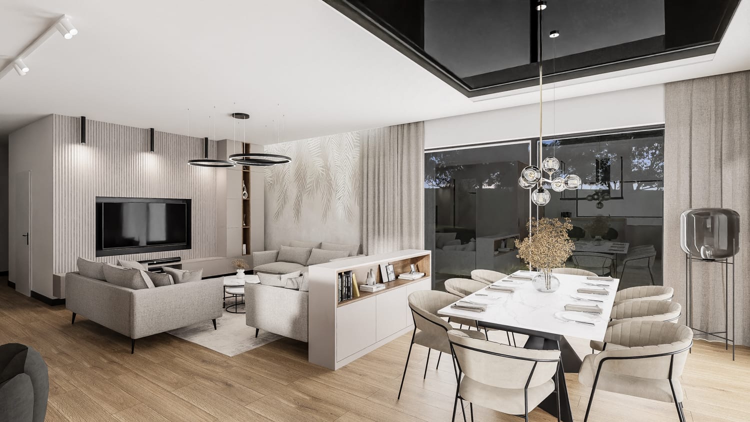 Kiedy projektujemy wnętrze domu, ważne jest, aby zapewnić harmonię i spójność między różnymi pomieszczeniami. Jadalnia i salon to często przestrzenie połączone z kuchnią, dlatego warto zastosować powtarzające się motywy i materiały. Jadalnia jest miejscem, gdzie spotykamy się przy stole, delektując się posiłkami, prowadząc rozmowy. Standardowo stół pomieści 8 osób, ma jednak możliwość rozkładania, co jest idealne do większych spotkań rodzinnych lub przyjęć. Nad stołem w części jadalnianej zastosowano sufit napinany w kolorze czarnym. Ten wybór kolorystyczny nadaje pomieszczeniu eleganckiego i nowoczesnego wyglądu. Sufit napinany w czerni doskonale kontrastuje z jasnymi ścianami i meblami, tworząc efektowne odbicie światła.
