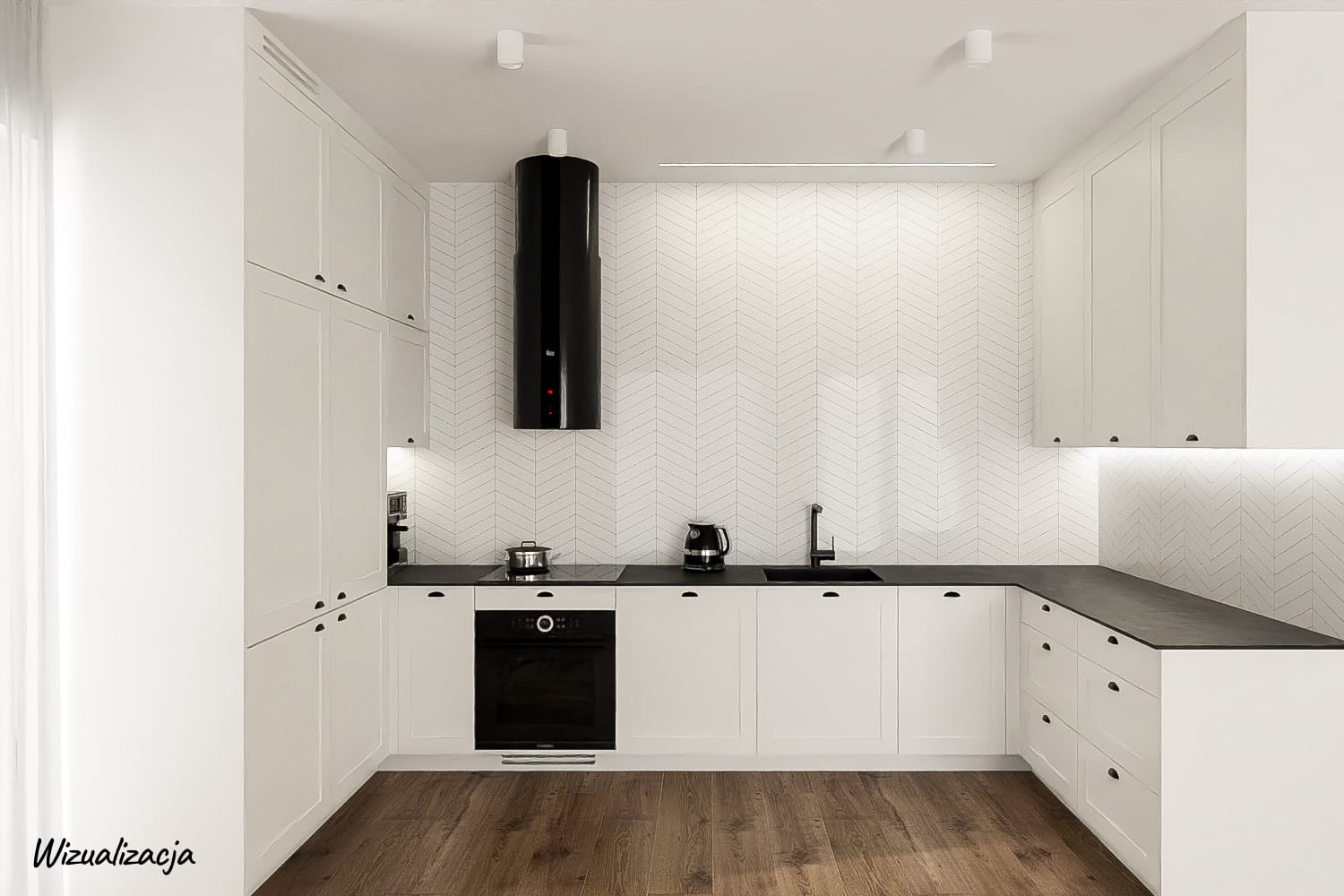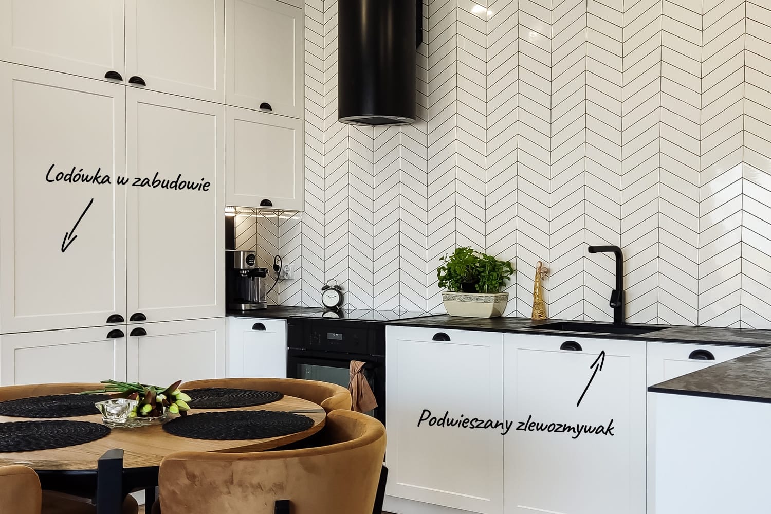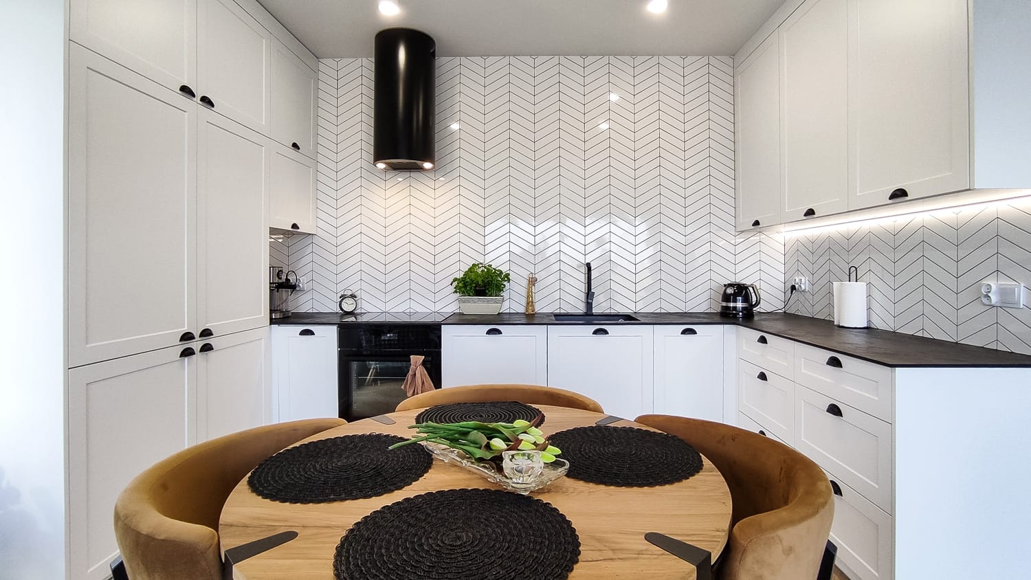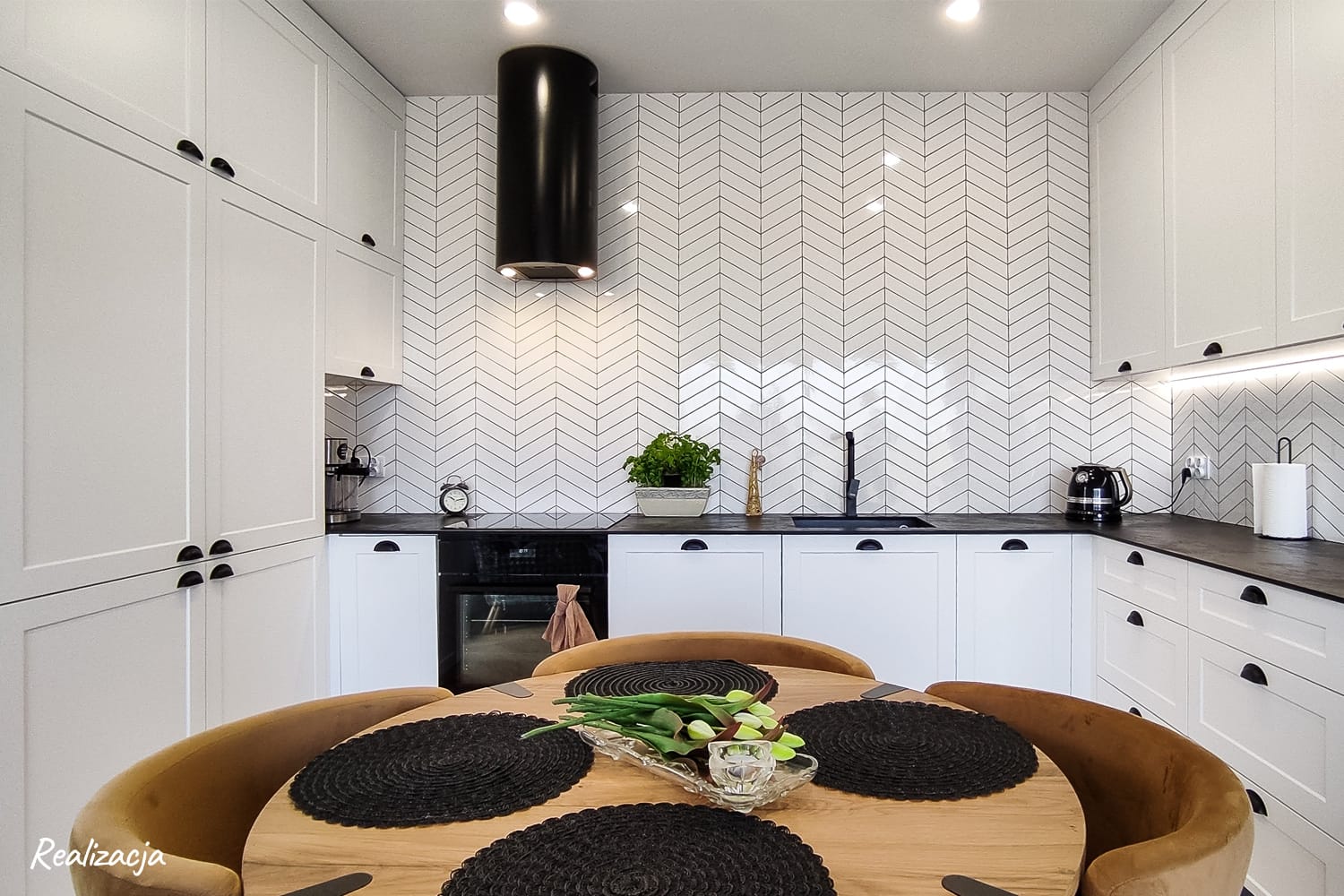 Połączenie bieli i czerni – jeden z symboli klasycznej elegancji. Elementem dekoracyjnym są fronty frezowane, lakierowane w kolorze biały półmat z uchwytem muszelką od włoskiego producenta Bosetti-Marella. Klasycznego designu dodaje biała płytka ułożona w jodełkę francuską. Okap Berg Floyd Negro występuje jako nowoczesny akcent. Dodatkową zaletą jest jego wysoka wydajność – ponad 700 m3/h.
