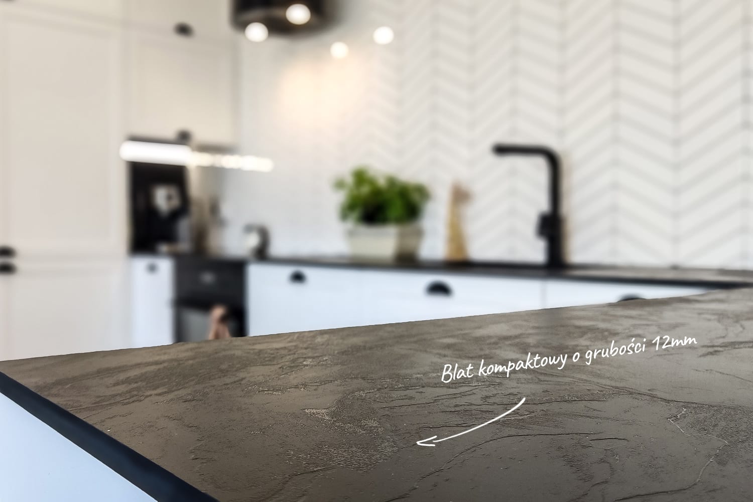 Blat Slim Line Czarny 0190 SL – wykonany z 12 mm płyty kompaktowej o monochromatycznym rdzeniu. Jest odporny na zadrapania, wysoką temperaturę, wodę oraz zabrudzenia np. plamy z wina. Blat kompaktowy umożliwił montaż zlewozmywaka podwieszanego – tutaj komora granitowa Berg Kubra czarna bazaltowa w towarzystwie baterii Franke Mythos z czarnej stali szlachetnej.