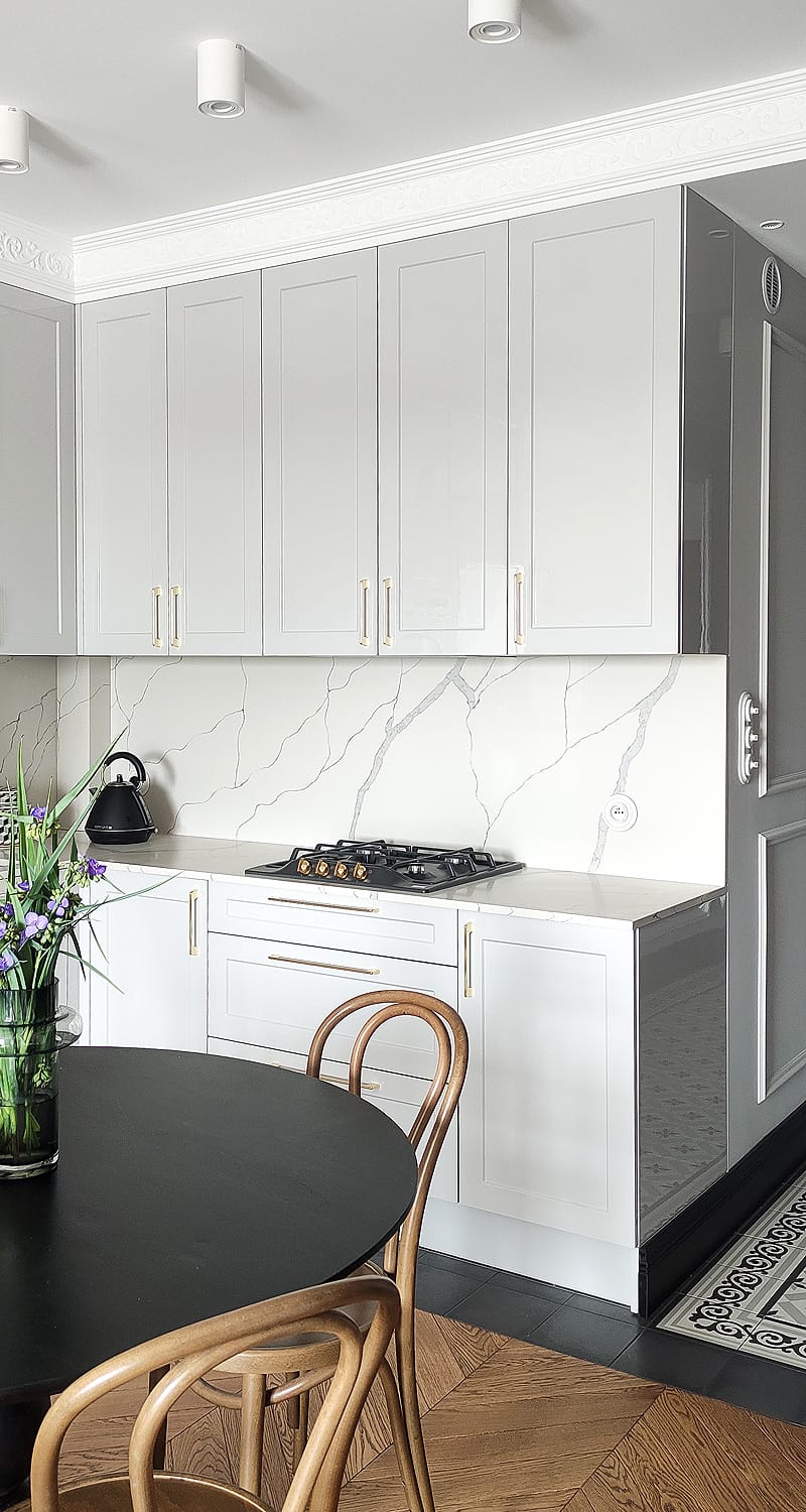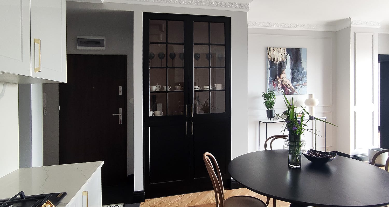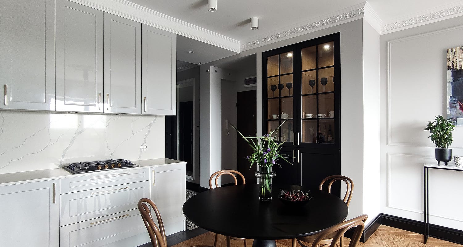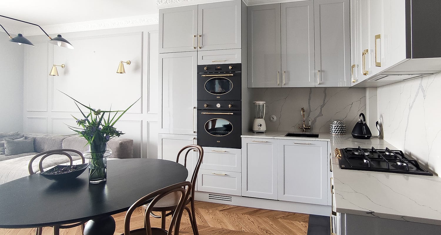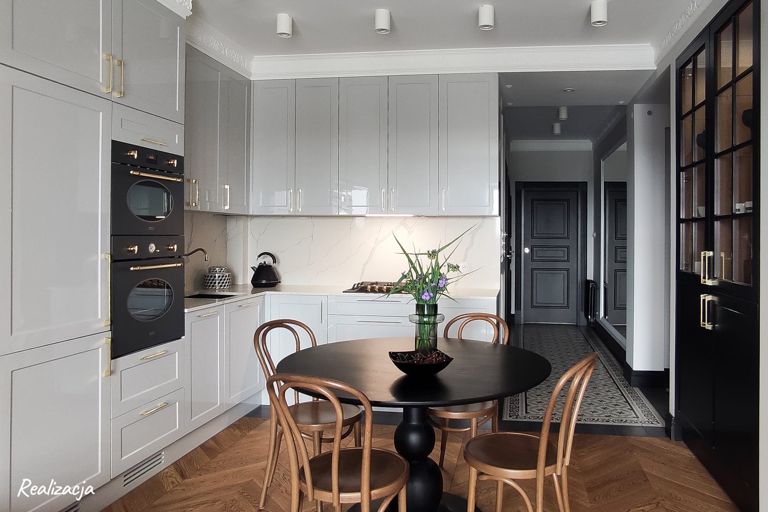 Stylizowane listwy przysufitowe oraz ścienne, jasny parkiet i wzorzyste płytki podłogowe, jasno określały kierunek, którym powinniśmy podążać. Chcieliśmy, by kuchnia łączyła w sobie dawną stylistykę ze współczesnymi trendami i technologią. Dzięki dopasowaniu kolorystyki do salonu, udało się także optycznie powiększyć całe wnętrze. Jak widać współczesne wnętrza wcale nie muszą być minimalistyczne i pozbawione duszy. Vintage wciąż jest w modzie i przy odpowiednim projekcie, może być idealnym rozwiązaniem także w Twoim domu!
