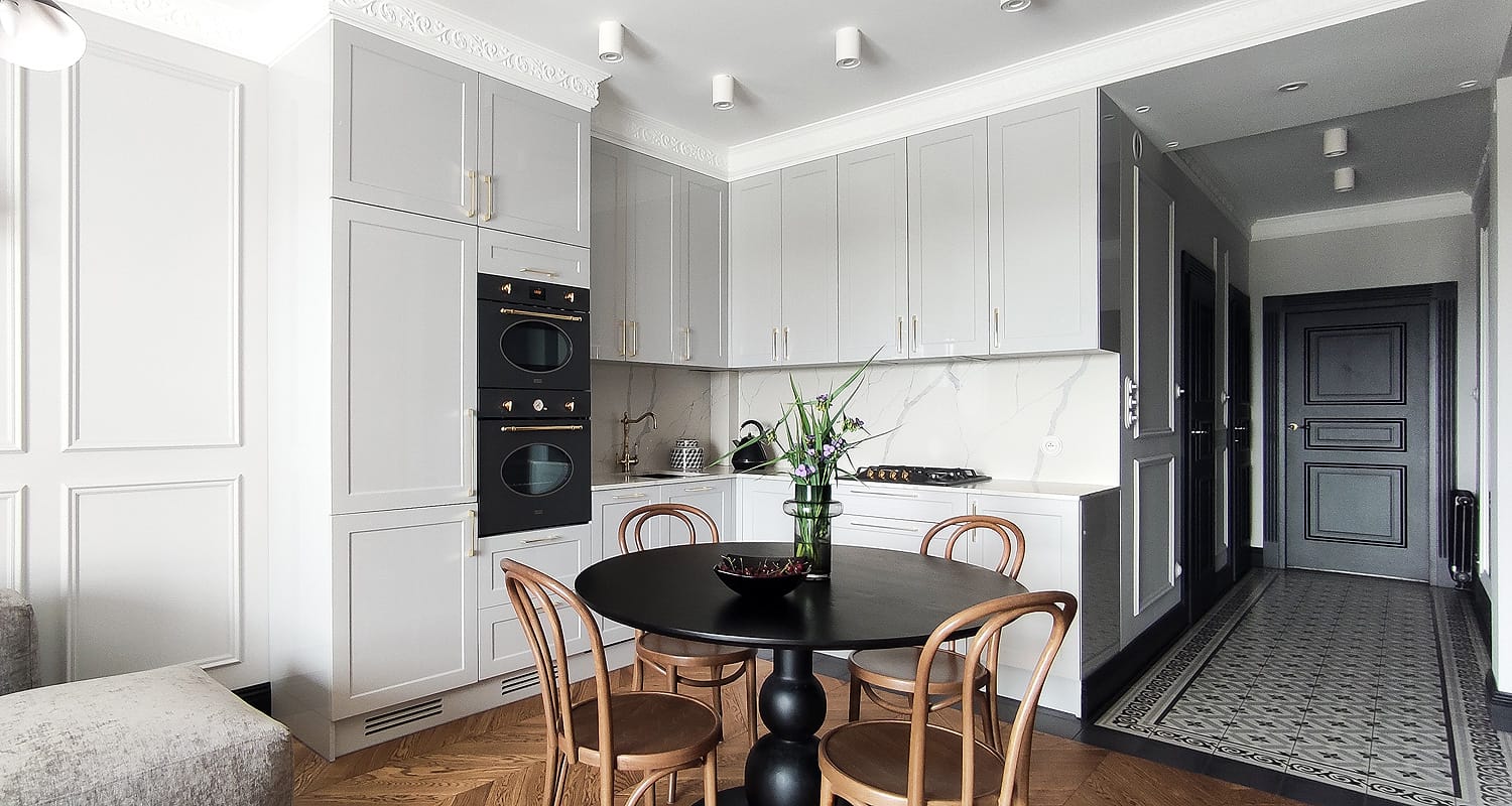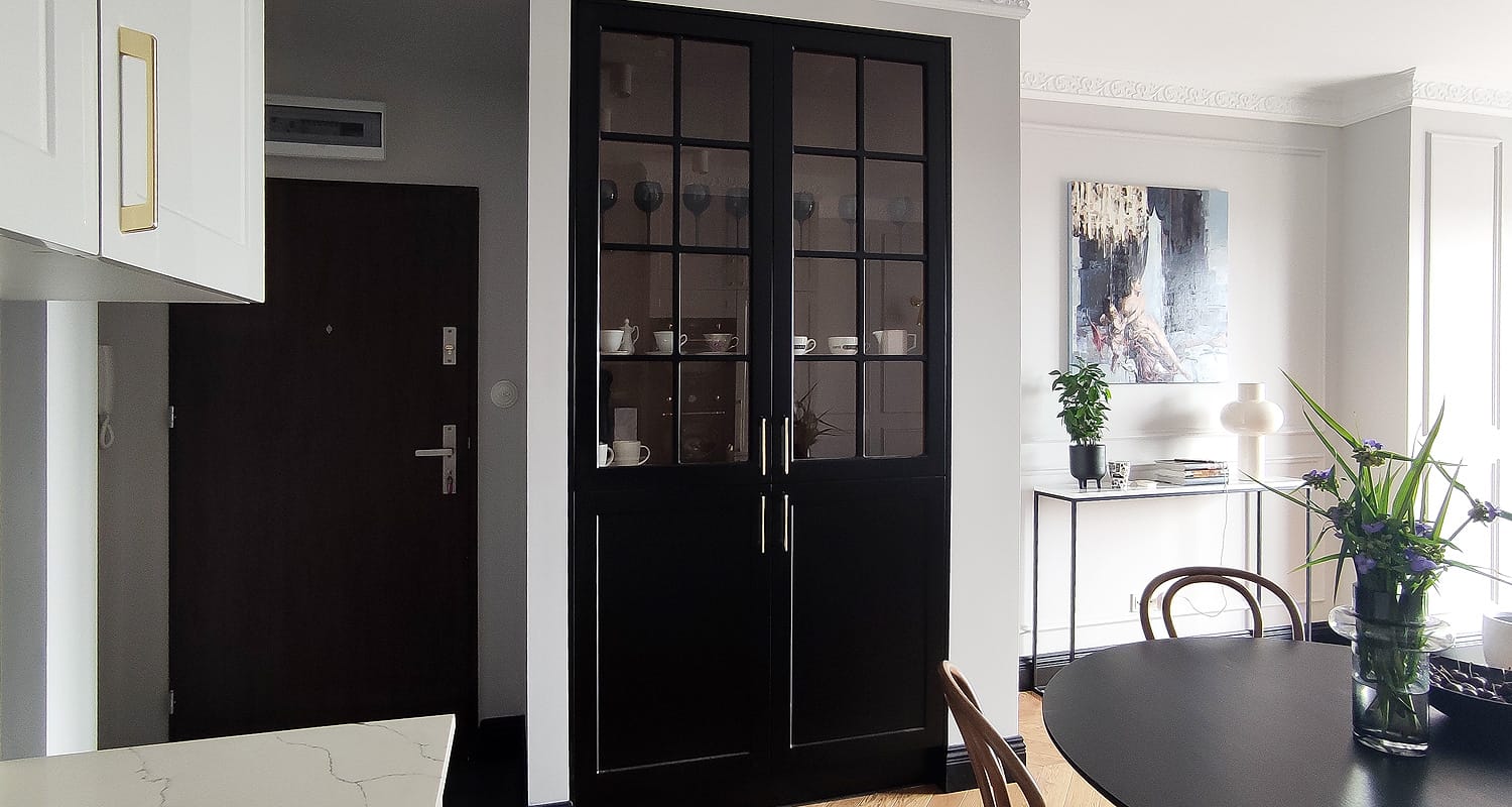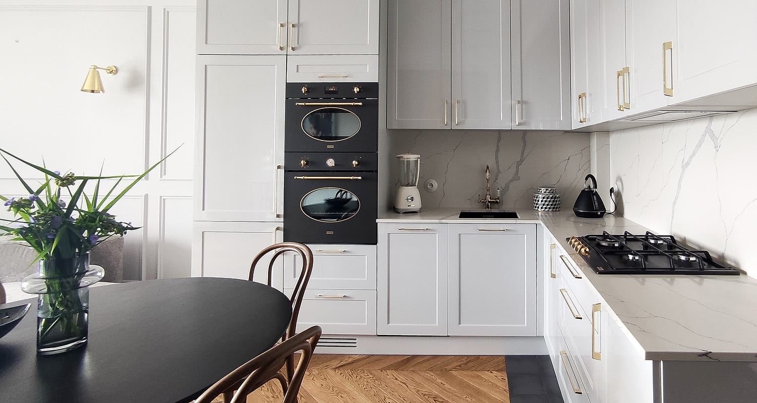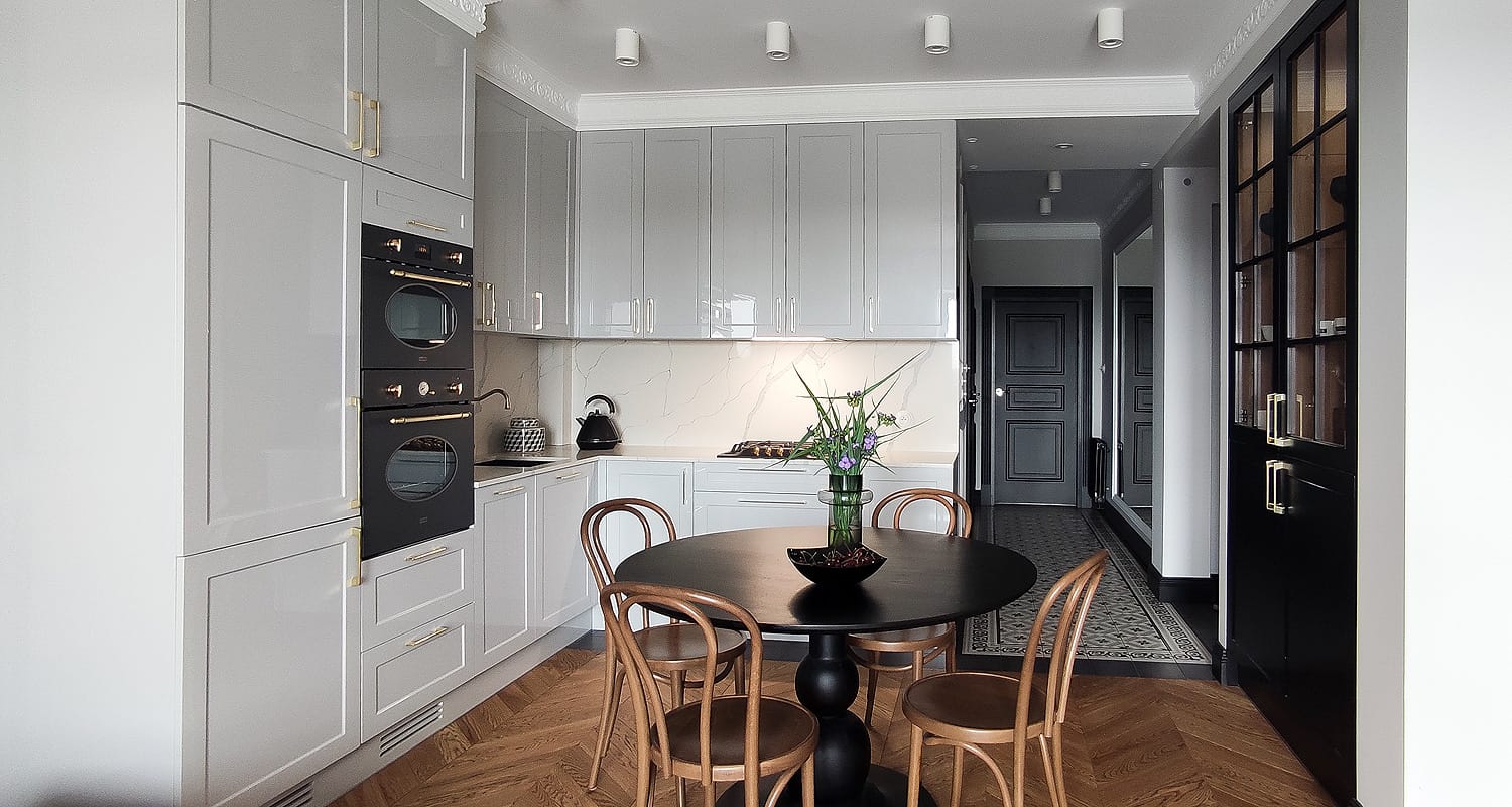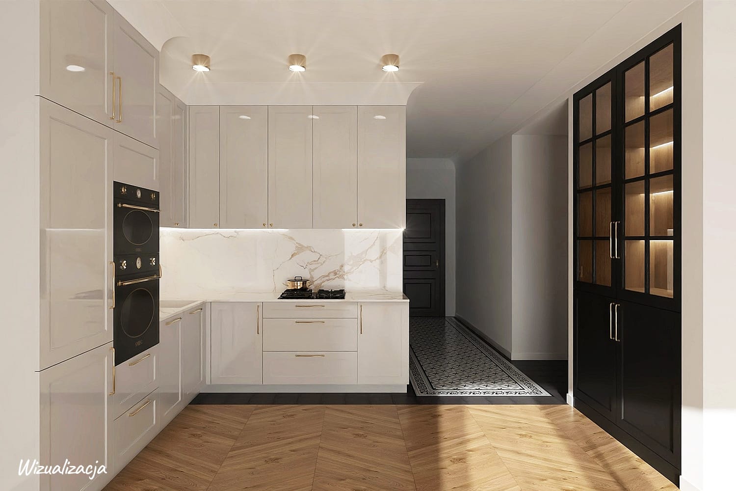 Stylizowane listwy przysufitowe oraz ścienne, jasny parkiet i wzorzyste płytki podłogowe, jasno określały kierunek, którym powinniśmy podążać. Chcieliśmy, by kuchnia łączyła w sobie dawną stylistykę ze współczesnymi trendami i technologią. Dzięki dopasowaniu kolorystyki do salonu, udało się także optycznie powiększyć całe wnętrze. Jak widać współczesne wnętrza wcale nie muszą być minimalistyczne i pozbawione duszy. Vintage wciąż jest w modzie i przy odpowiednim projekcie, może być idealnym rozwiązaniem także w Twoim domu!