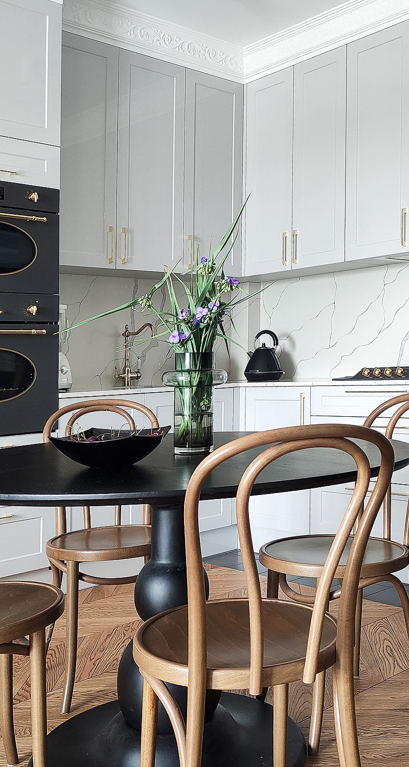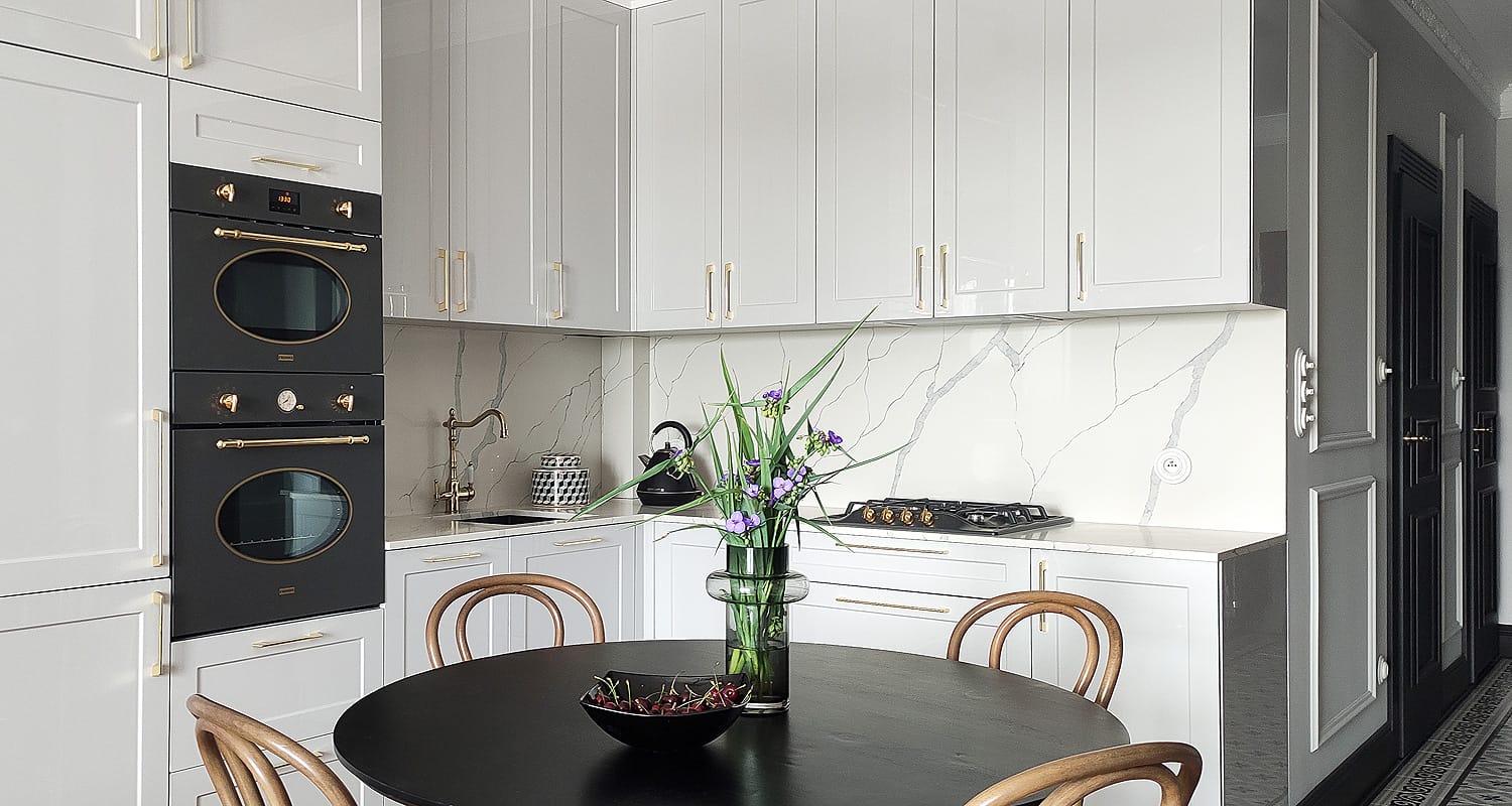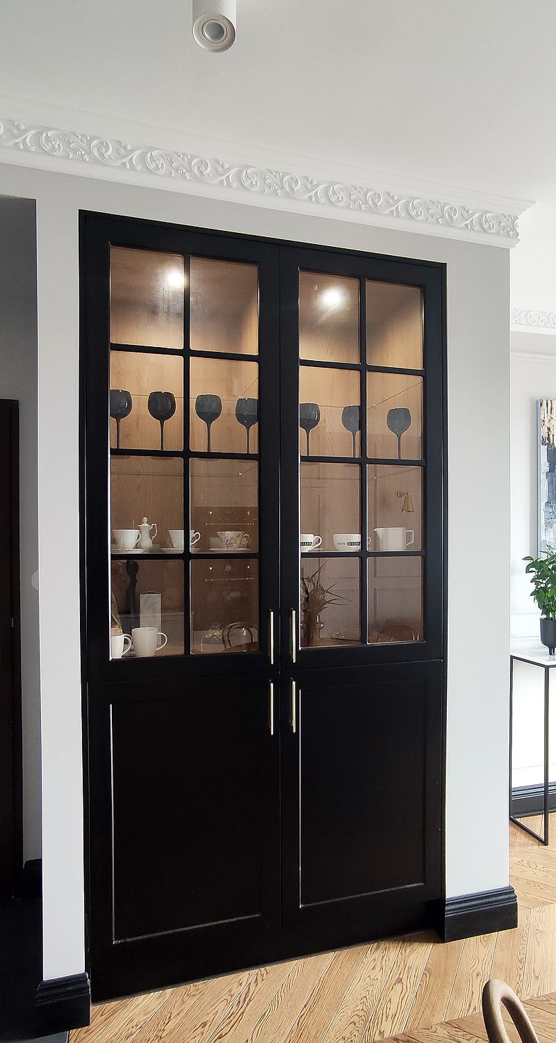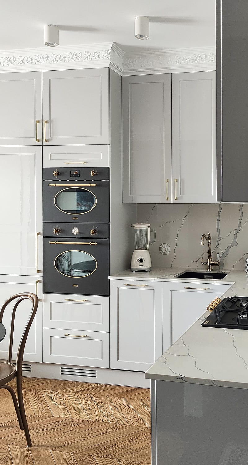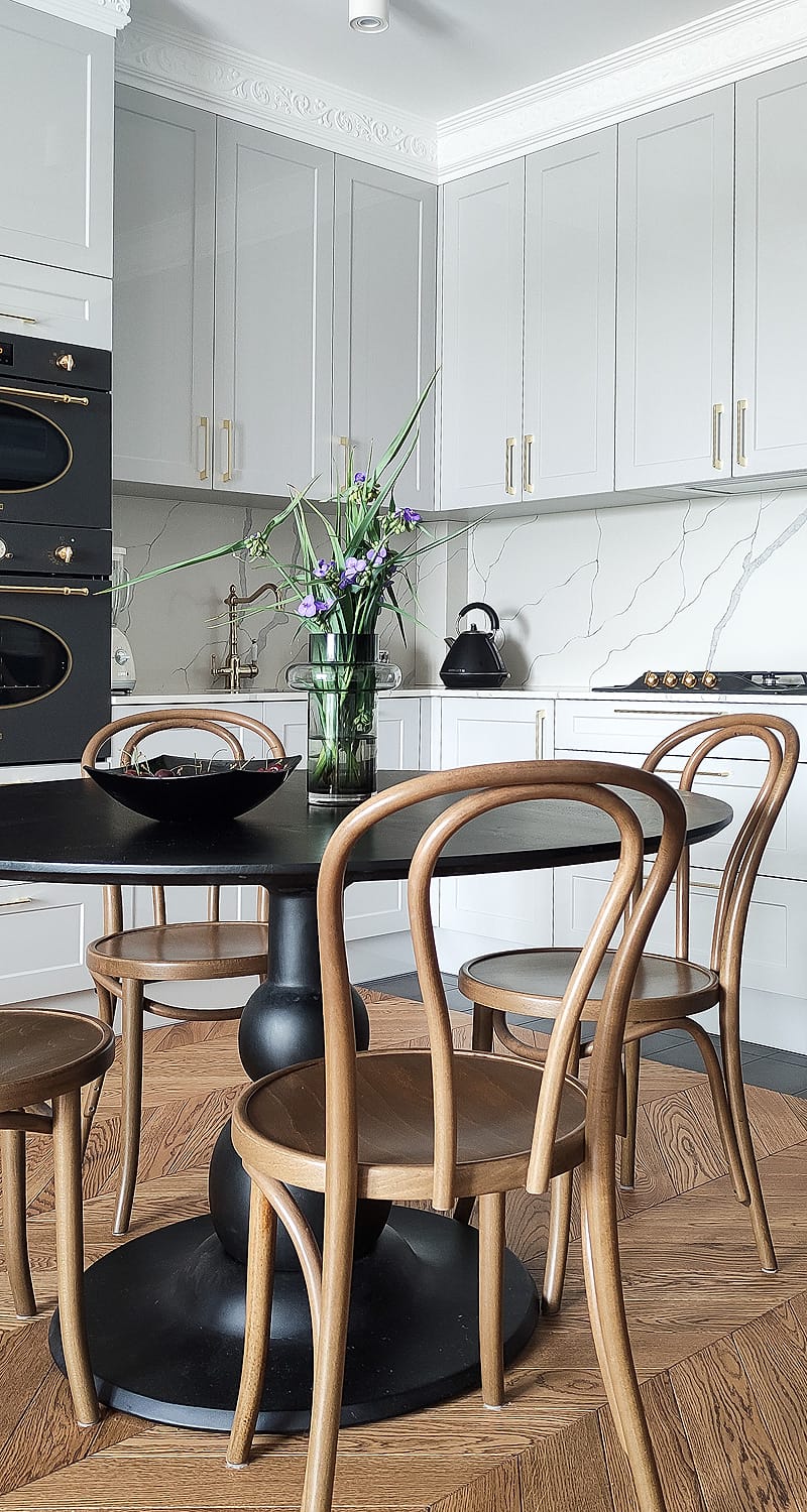 Stylizowane listwy przysufitowe oraz ścienne, jasny parkiet i wzorzyste płytki podłogowe, jasno określały kierunek, którym powinniśmy podążać. Chcieliśmy, by kuchnia łączyła w sobie dawną stylistykę ze współczesnymi trendami i technologią. Dzięki dopasowaniu kolorystyki do salonu, udało się także optycznie powiększyć całe wnętrze. Jak widać współczesne wnętrza wcale nie muszą być minimalistyczne i pozbawione duszy. Vintage wciąż jest w modzie i przy odpowiednim projekcie, może być idealnym rozwiązaniem także w Twoim domu!